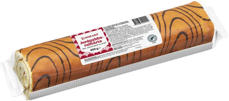 Rulltårta med jordgubbsfyllning och ringlad choklad ovanpå. 450 gram.