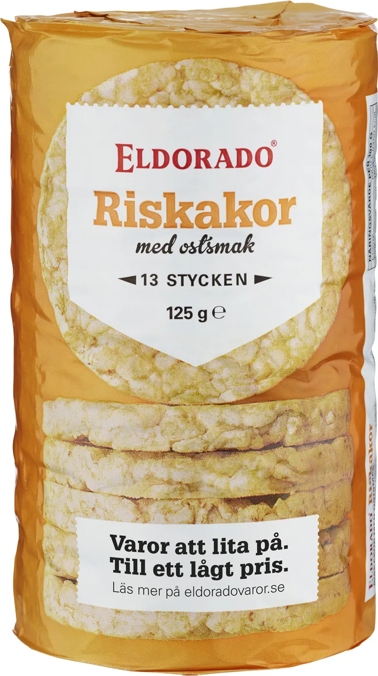 Råris 78%, rapsolja, kryddblandning 9,8% (vasslepulver (MJÖLK), OSTPULVER, salt, jästextrakt (jästextrakt, solrosolja), arom (MJÖLK), surhetsreglerande medel (mjölksyra, kalciumlaktat), gurkmejaextrakt, färgämne (paprikaextrakt)). Kan innehålla spår av SOJA och SESAMFRÖ.
