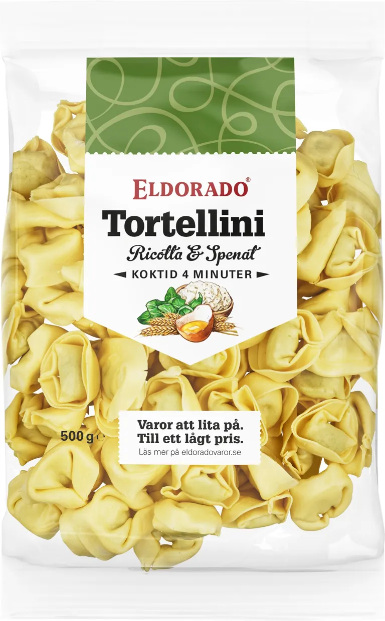 Färsk tortellini med fyllning av ricotta och spenat. Koktid 4 minuter. 500 gram.