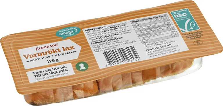 Portionsbit av ASC-certifierad varmrökt naturell lax. 125 gram.