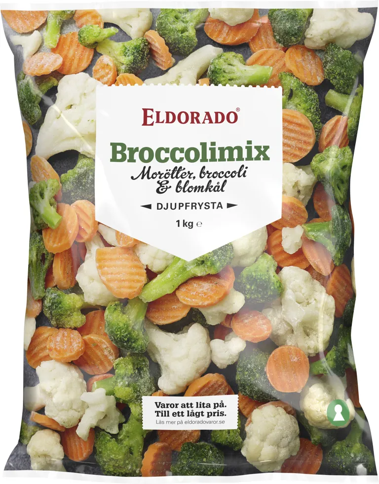 Djupfryst broccolimix. Morötter, broccoli och blomkål. 1 kg.