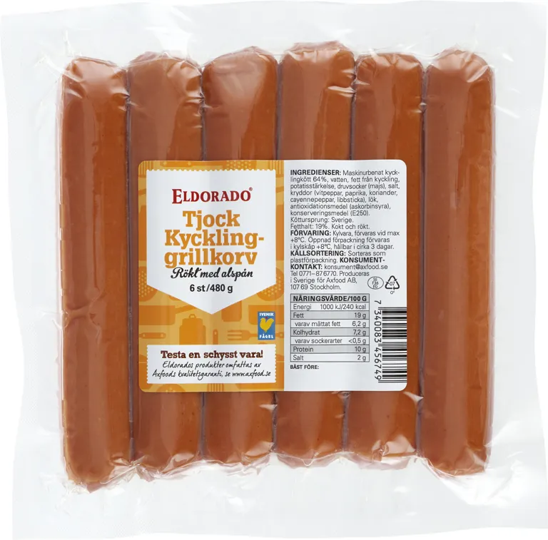 Maskinurbenat kycklingkött 64%, vatten, fett från kyckling, potatisstärkelse, druvsocker (majs), salt, kryddor (vitpeppar, paprika, koriander, cayennepeppar, libbsticka), lök, antioxidationsmedel (askorbinsyra), konserveringsmedel (E250).