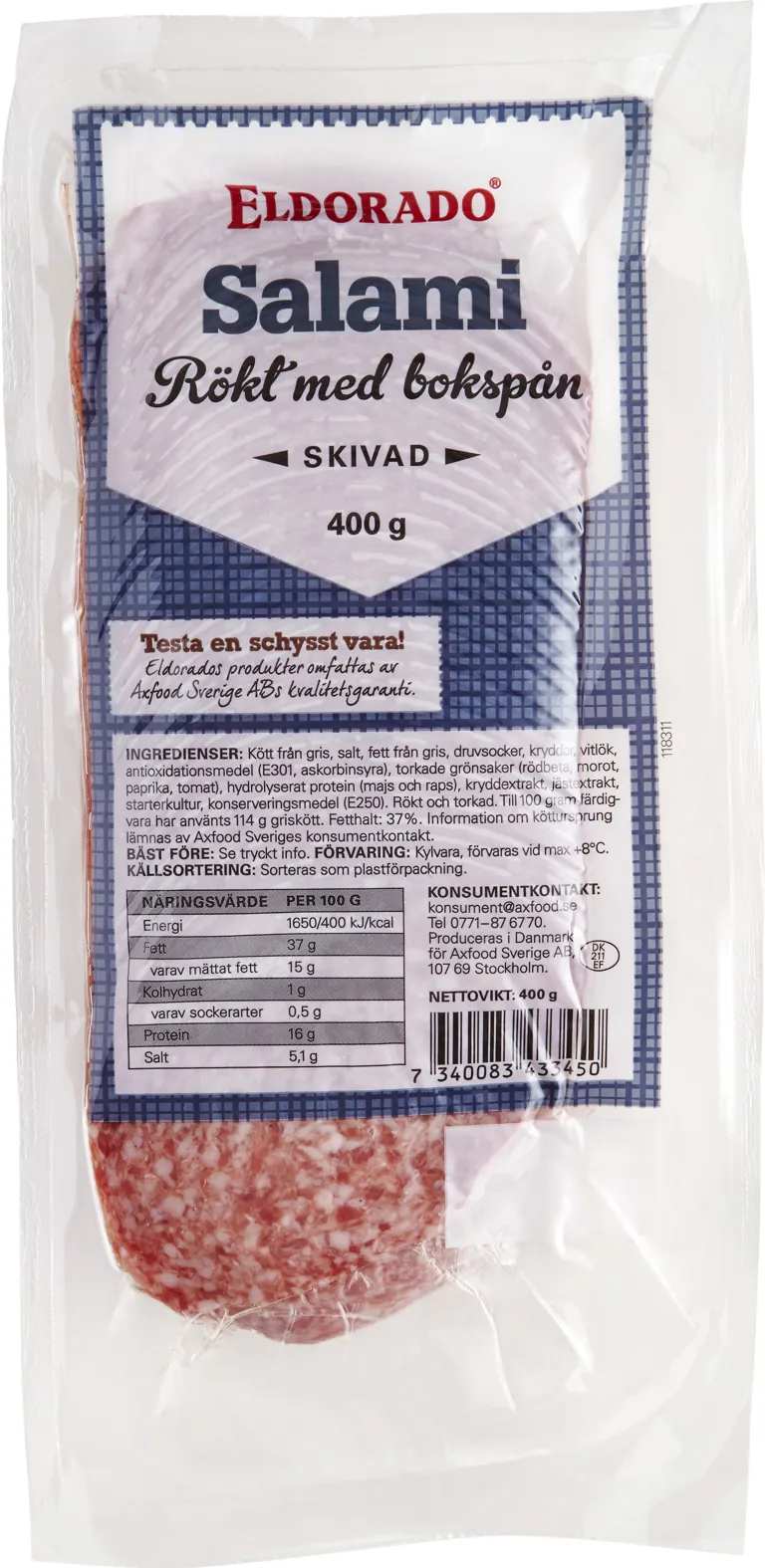 Kött från gris, salt, fett från gris, druvsocker, kryddor, vitlök, antioxidationsmedel (E301, askorbinsyra), torkade grönsaker (rödbeta, morot, paprika, tomat), hydrolyserat protein (majs och raps), kryddextrakt, jästextrakt, starterkultur, konserveringsmedel (E250). Rökt och torkad. Till 100 gram färdigvara har använts 114 g griskött. Fetthalt 37%. Köttursprung: Danmark.