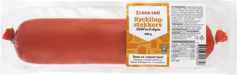 Maskinurbenat kycklingkött 60%, vatten, fett från kyckling, potatisstärkelse, druvsocker (majs), salt, kryddor (vitpeppar, paprika, koriander, cayennepeppar, libbsticka), lök, antioxidationsmedel (askorbinsyra), konserveringsmedel (E250).