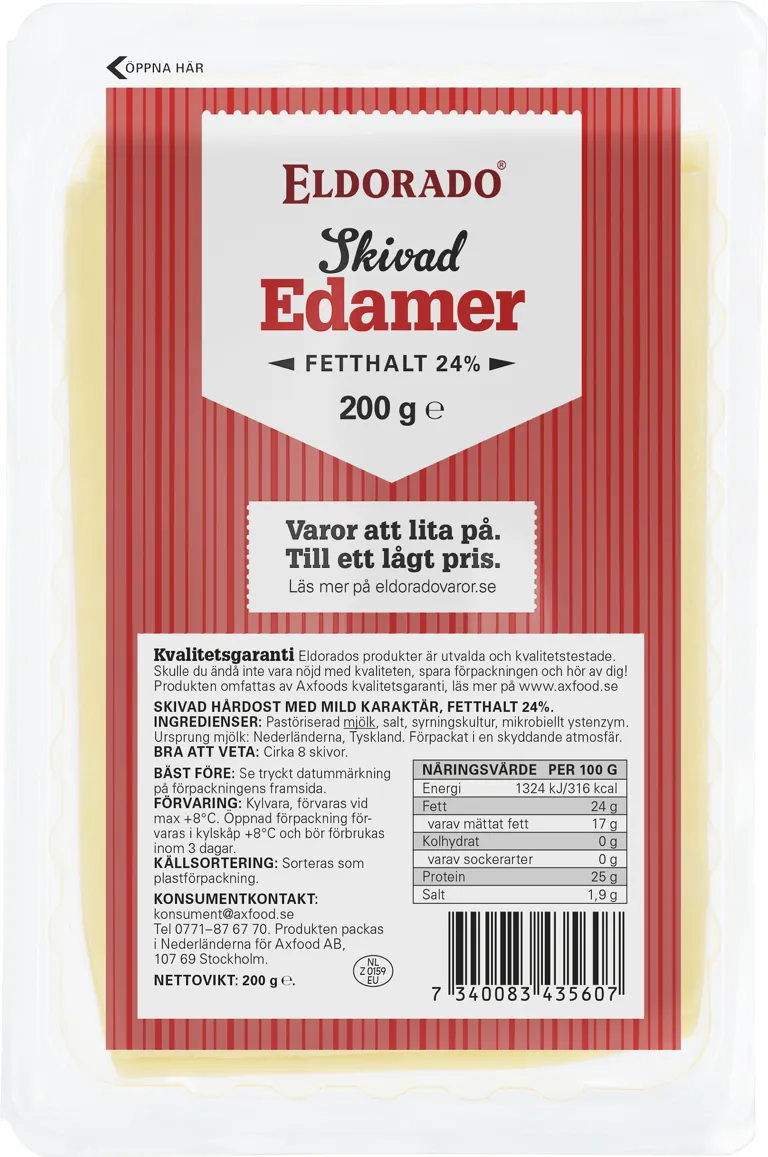 Eldorado Skivad Edamer är en mild hårdost med 24 % fett. Färdigskivad och enkel att använda på smörgås, i toast eller till matlagning. Osten är gjord på pastöriserad mjölk och packad i skyddande atmosfär för att hålla sig fräsch. Levereras i ett smidigt 200‑gramsformat med cirka åtta skivor. Ett prisvärt och praktiskt val för vardagen.