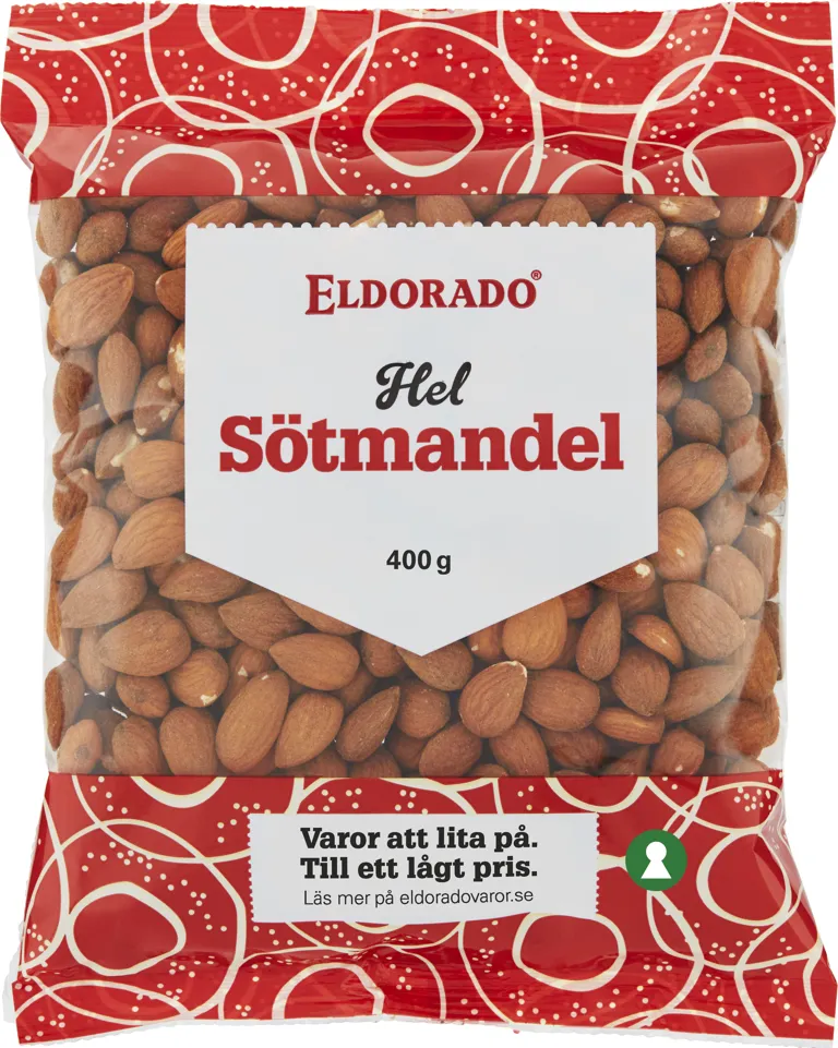 SÖTMANDEL. Kan innehålla spår av JORDNÖT, HASSELNÖT, VALNÖT, CASHEWNÖT, PEKANNÖT, PARANÖT, PISTASCHNÖT och MACADAMIANÖT.