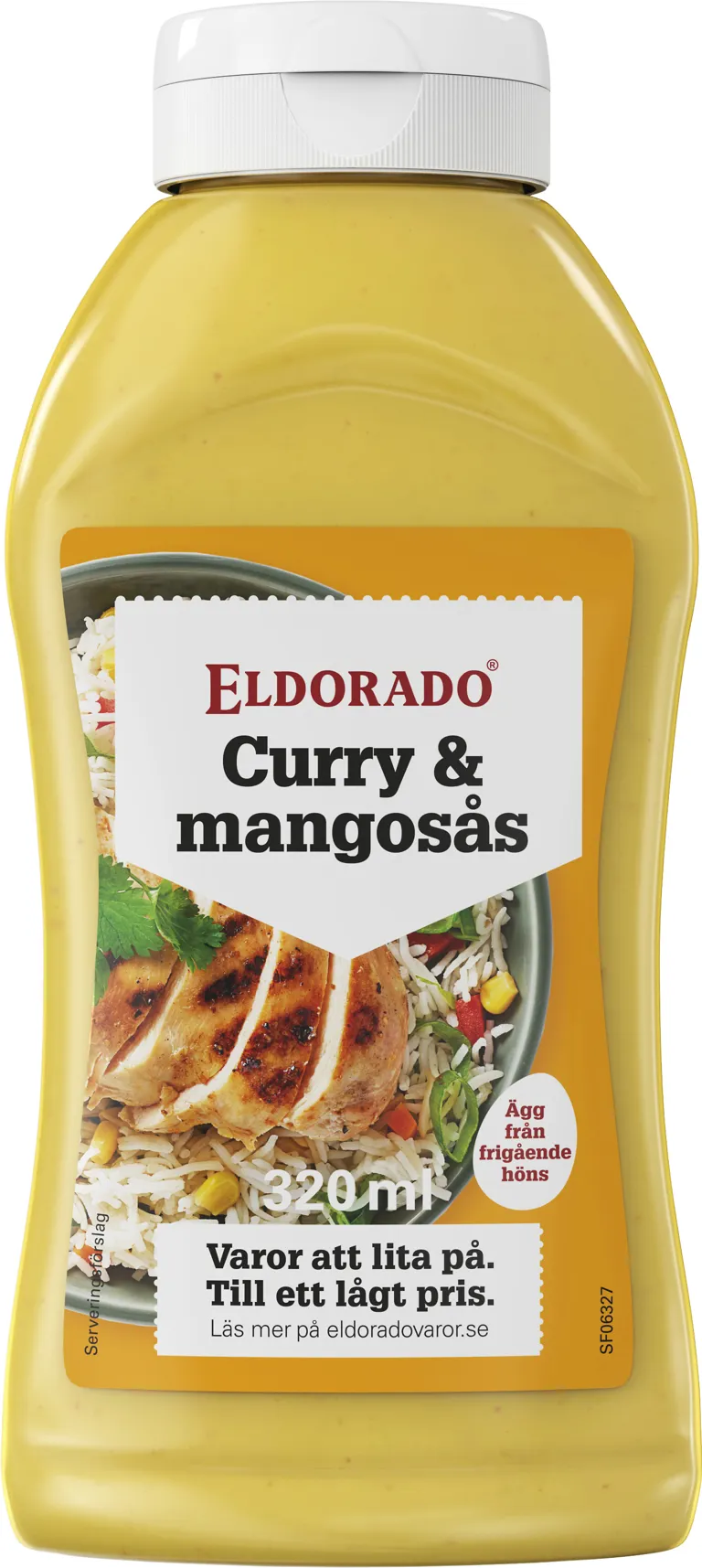 Vatten, rapsolja, mangojuice (från koncentrat) 17%, ättika, apelsinjuice (från koncentrat), socker, modifierad majsstärkelse, salt, curry (0,8%), SENAPSPULVER, ÄGGULEPULVER, naturlig curryarom (innehåller SELLERI), lökpulver, surhetsreglerande medel (mjölksyra), färgämne (betakaroten), konserveringsmedel (E202), stabiliseringsmedel (E415).