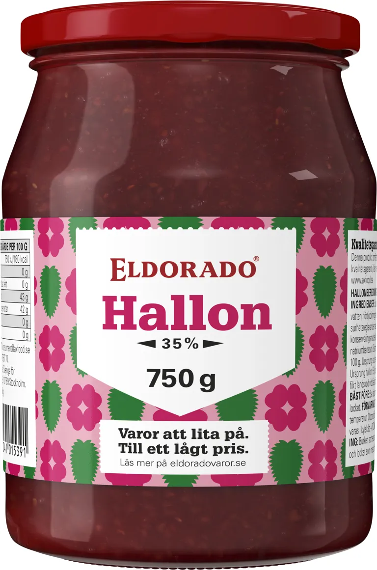 Hallon, glukos-fruktossirap, vatten, socker, förtjockningsmedel (pektin), surhetsreglerande medel (citronsyra), konserveringsmedel (E202, E211). Fruktmängd: 35 g hallon per 100 g. Total mängd socker: 42 g per 100 g.