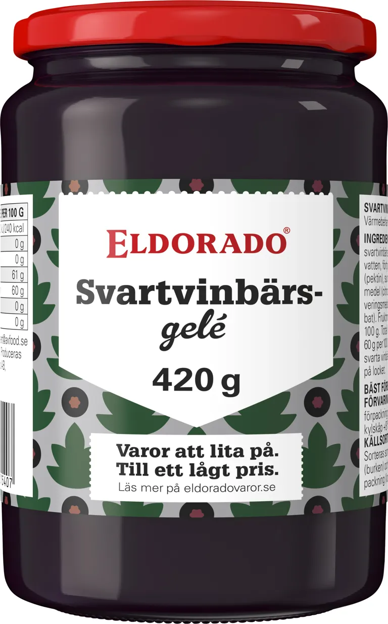 Socker, svartvinbärsjuice 31%, vatten, förtjockningsmedel (pektin), surhetsreglerande medel (citronsyra), konserveringsmedel (kaliumsorbat). Fruktmängd: 31 g per 100 g. Total mängd socker: 60 g per 100 g.