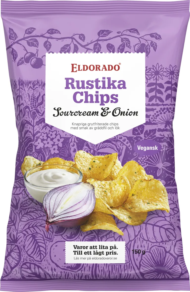 Rustika chips sourcream & onion med smak av gräddfil & lök. Grytfriterade och knapriga. Veganska. 150 gram.