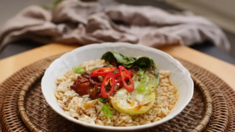 En värmande och comforting kycklingbowl serverad med jasminris, pak choi och en varm buljong. Perfekt för kalla dagar, eller när du bara behöver något tryggt och varmt i magen.