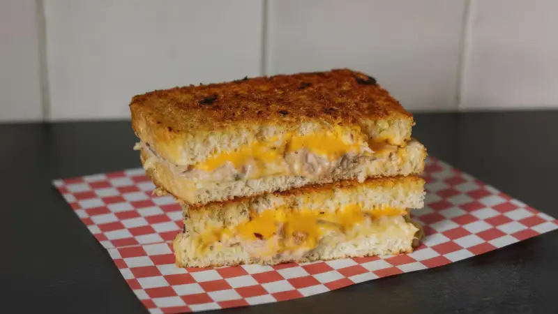 En krämig tonfiskröra med två sorters ost, stekt gyllne i smör tills brödet blir frasigt och osten smälter. En varm, enkel och supergod lunch eller middag! Med produkter från Eldorado kostar Tuna Melt ca 22 kr per portion.